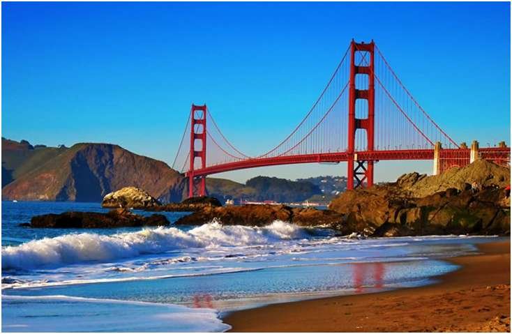 Arching across San Francisco Bay, joining San Francisco and Marin County, the Golden Gate Bridge has been a California icon since it was built in the 1930s. Contrasting with the blue water, the bridge's orangish-red color is an aesthetic accent that brings a unique quality to the city. It also has a unique presence when it is shrouded in fog with just the peaks of the main towers projecting through the low lying cloud. The bridge is approximately 2 miles long and part of Hwy 101 or SR 1.